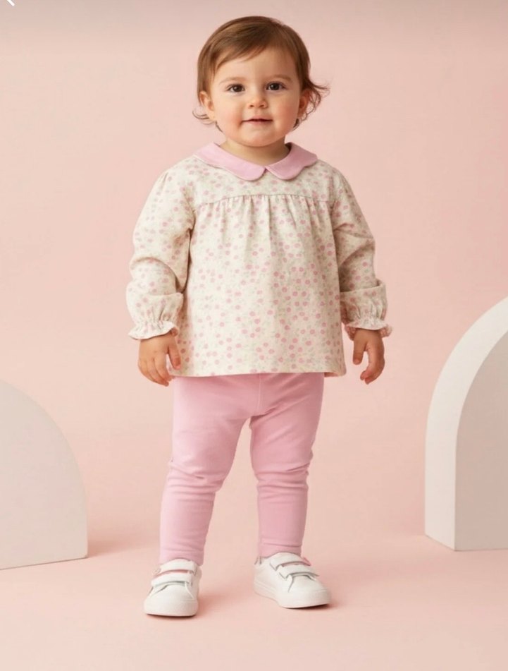 Uzun Kollu Pembe çiçekli Bebek Kız Takımı