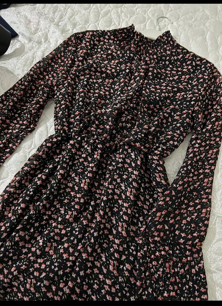 Uzun kollu, bol kesim bu elbise, koyu pembe çiçek desenleriyle bohem Paris tarzını yansıtıyor.