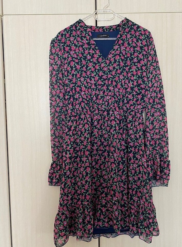 Bohem tarzda, koyu pembe çiçek desenli midi elbise. Uzun kollu, V yakalı, bol kesim ve fırfır detaylı, yumuşak sentetik kumaştan, günlük kullanım için uygundur.