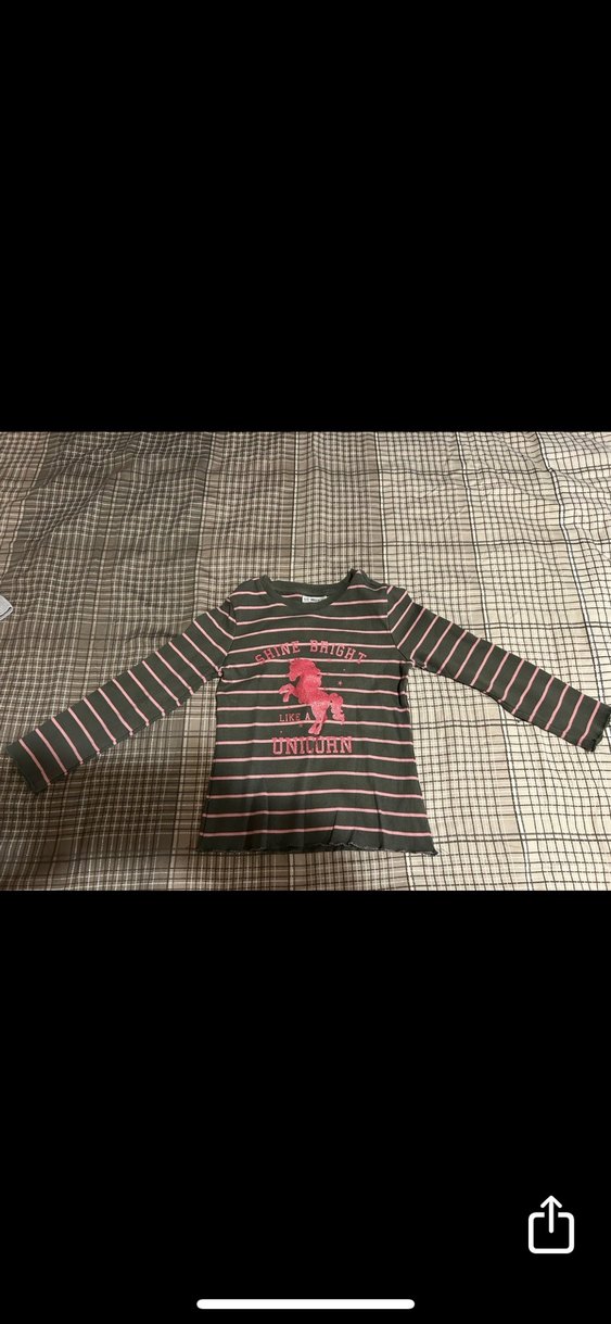 Dar kesim, uzun kollu, bisiklet yaka kız tişörtü. Yumuşak sentetik kumaş, pembe çizgili ve örme dokulu, baskılı tek boynuzlu at figürüyle.