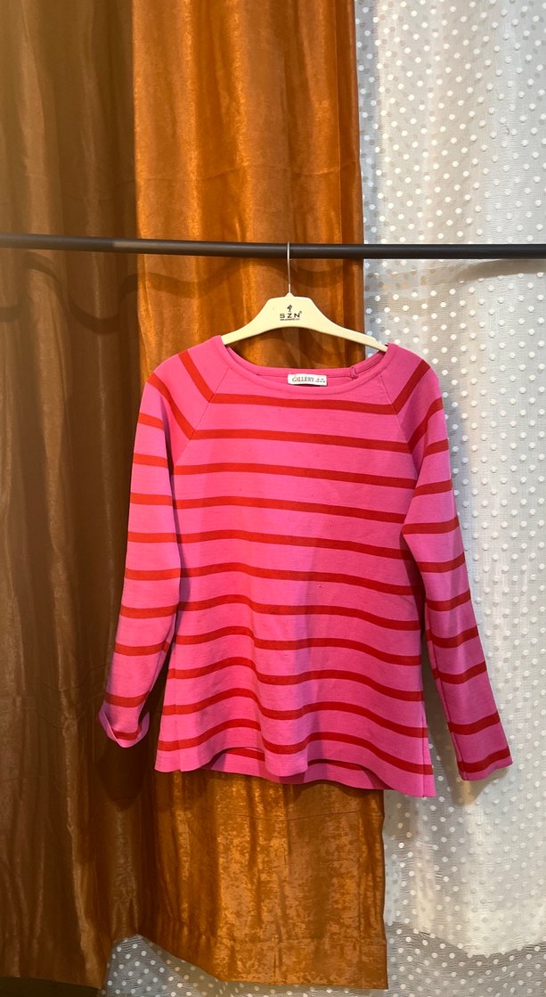 Uzun kollu, kayık yaka, bol kesim kız triko bluz. Pembe ve kırmızı çizgili, renkli ve rahat sokak stili için uygundur.