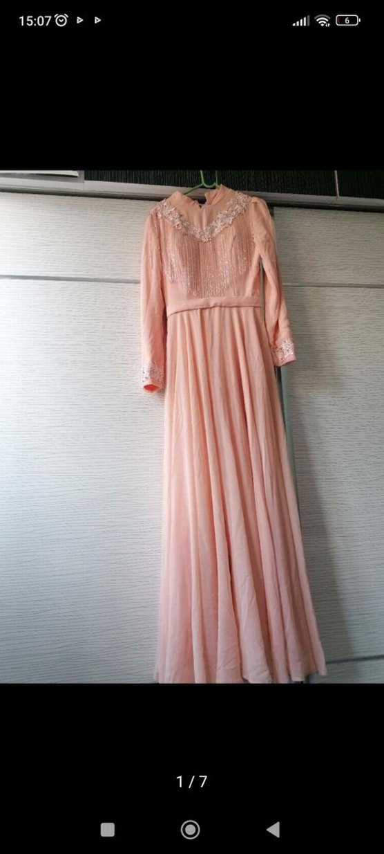Uzun kollu, V yaka ve drape detaylı bu pastel pembe abiye elbise, loose fit kesimiyle klasik ve vintage bir şıklık sunar. Düğünler için uygundur.