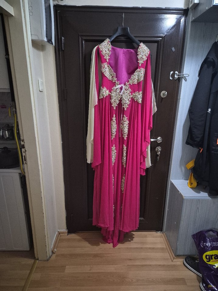 Uzun kollu, ı, drapeli ve bol kesim pembe abiye elbise. kına geceleri için desenli detaylara sahiptir.