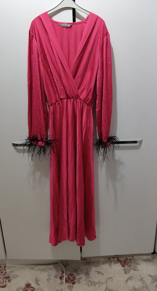 Uzun pembe elbise, drapeli detaylı ve V yakalıdır. Uzun kollu olup tüy süslemeleriyle avant-garde bir tarz sunar. yeni utusuz olduğu için böyle gözüküyor