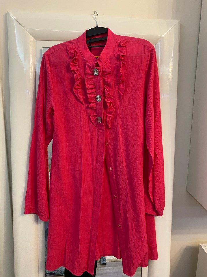 Uzun Kollu Pembe Fırfırlı Keten Gömlek