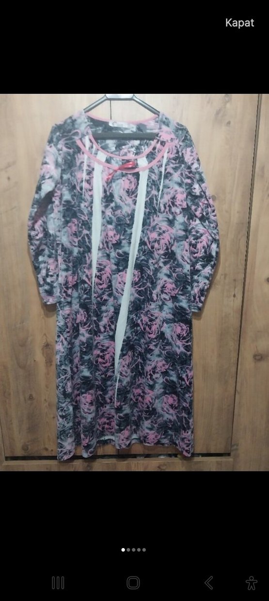 Uzun kollu, bol kesim pembe ve gri batik desenli kadın elbisesi, rahatlığı sokak modasıyla buluşturuyor. en 51 boy 1,15 cm