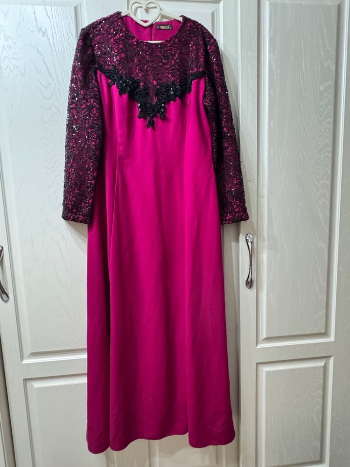 Uzun Kollu Pembe İşlemeli Abiye Elbise