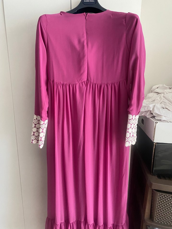 Uzun kollu, bol kesim kadın elbisesi parlak pembe ipeksi kumaş, işlemeli detaylar ve volanlarla. Mütevazı V yakalı, bohem tarzda düğün için uygun.