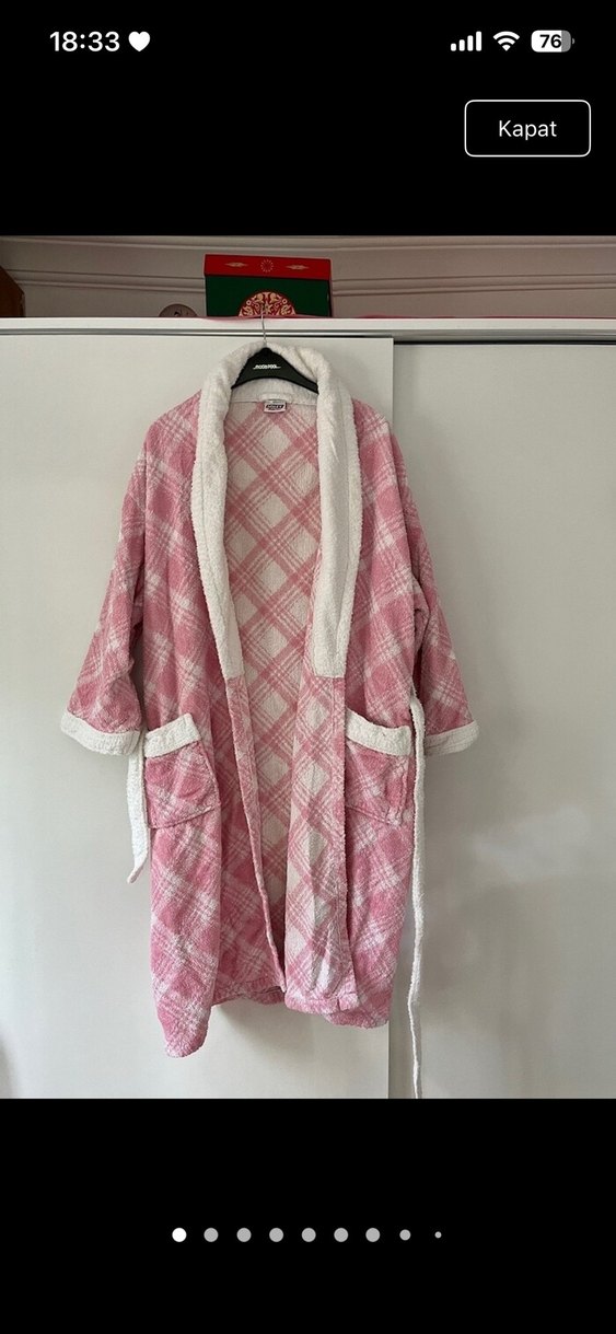 Uzun kollu, bol kesim pembe sabahlık. Yumuşak dokulu, iki ön cepli ve kemerli rahat kullanım sağlar. Konfor ve sıcaklık için ideal. ️