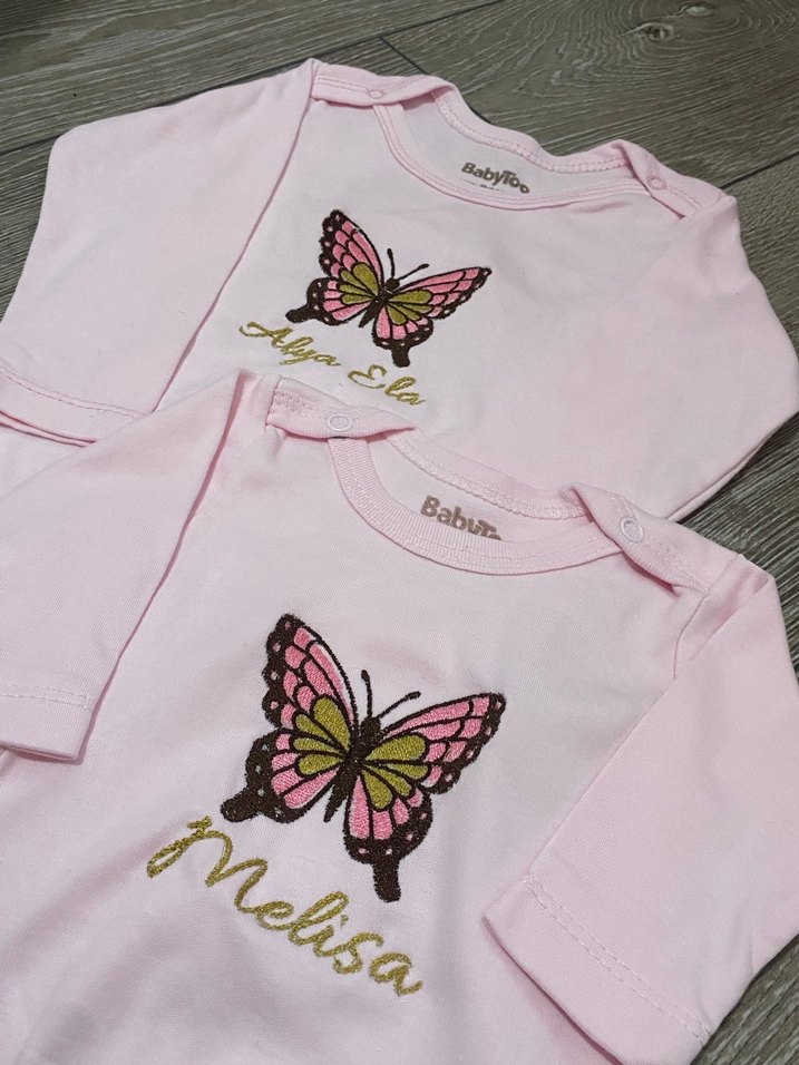 Uzun kollu, bisiklet yaka pembe bebek body, kişiye özel nakış tasarımı yapılır. Kardeş kombininin en güzel hali Adet fiyatıdır.