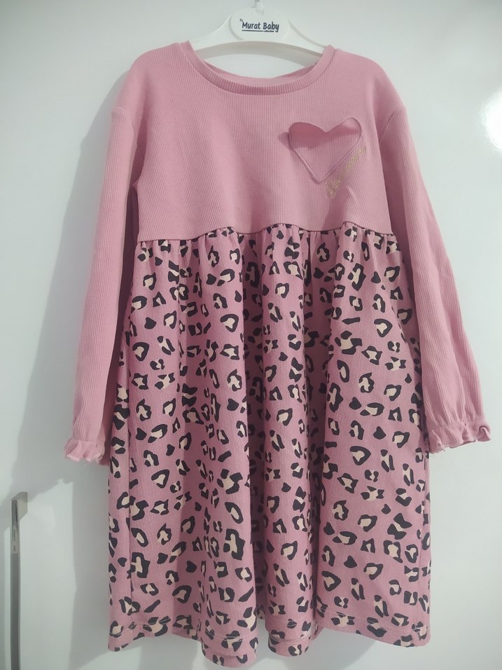 Uzun kollu, yuvarlak yakalı, bol kesim kız çocuk elbisesi. Pastel pembe renk, baskılı fırfırlı etek ve göğüste kalp detayı bulunur. Yumuşak ve sıcak kumaş.