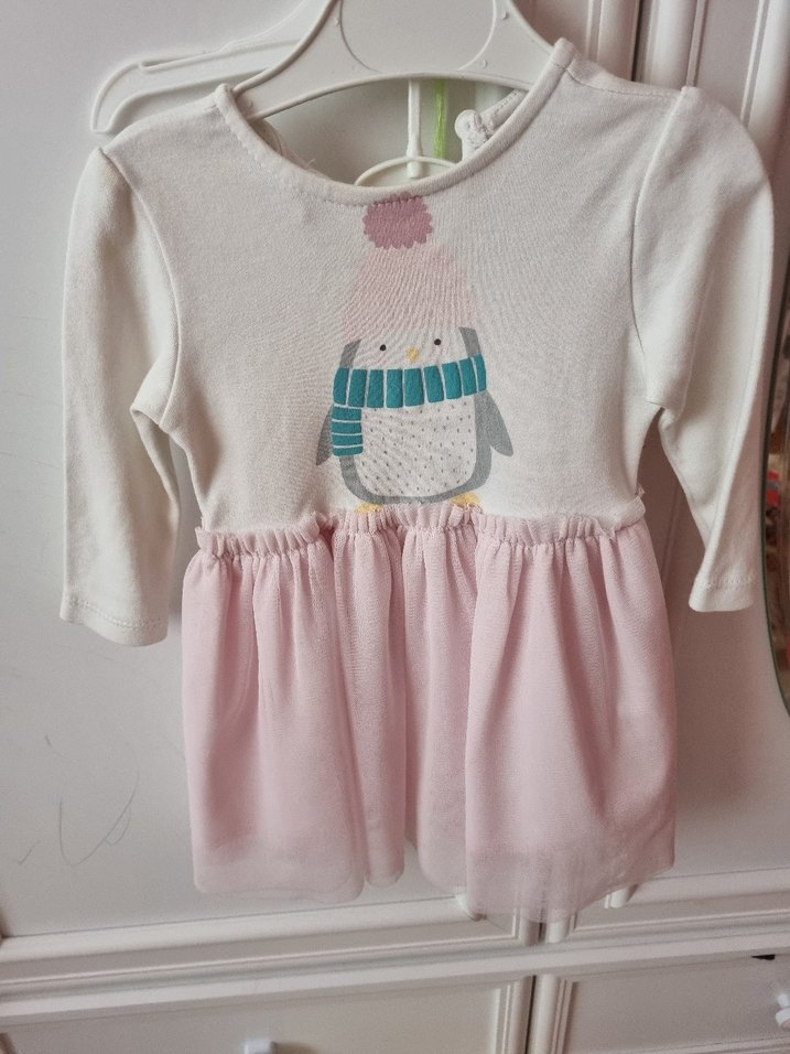 Pamuklu, uzun kollu, yuvarlak yakalı pembe elbise. Baskılı penguen deseni ve belde fırfır detayı bulunur.