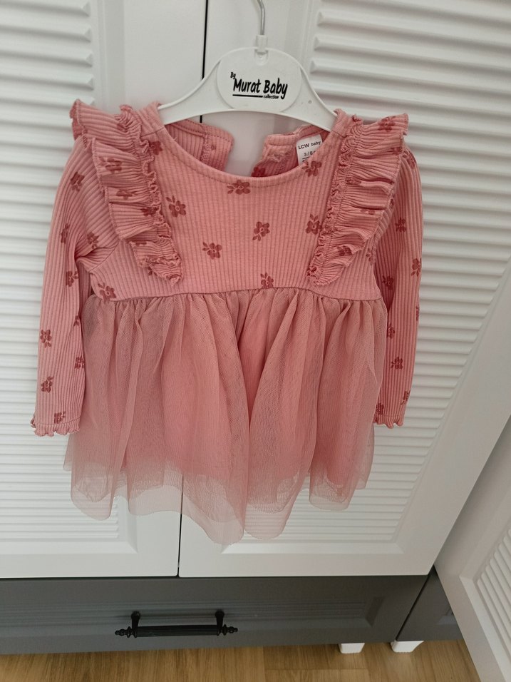 Uzun kollu, bisiklet yakalı, işlemeli desenli ve fırfır detaylı pembe kız çocuk elbisesi. Yumuşak sentetik kumaştan, tül etekli. LCW ürün Kız bebek tütülü elbise 3-6 ay Konya içi veya uygulama