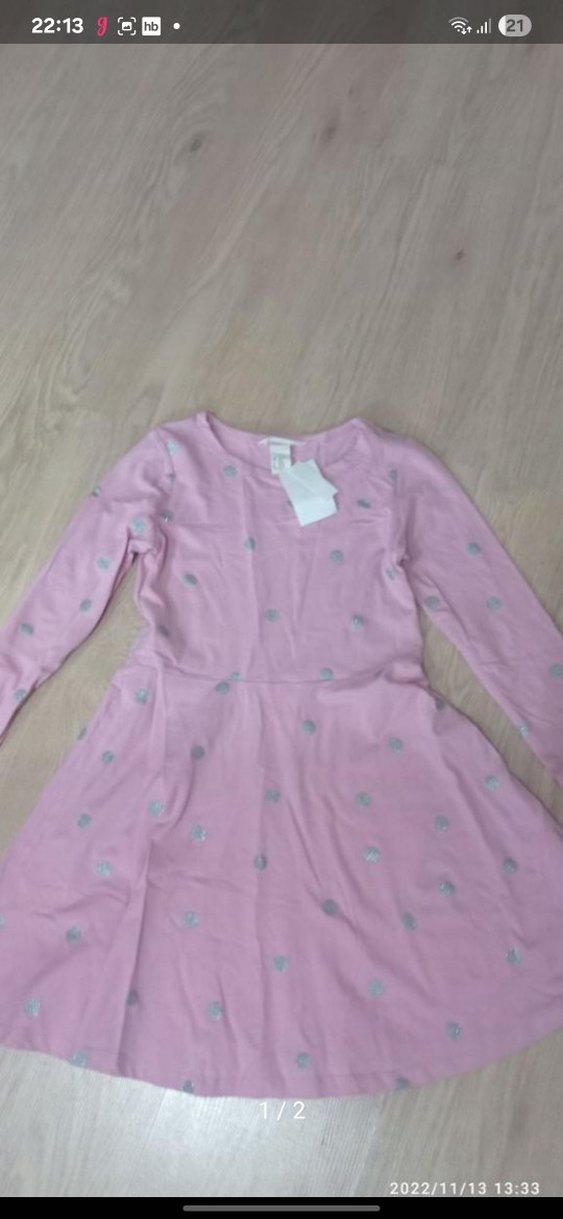 Uzun kollu, yuvarlak yakalı, düğmeli ve baskılı desenli pembe kız çocuk elbisesi. Rahat ve yumuşak kumaştan üretilmiştir.