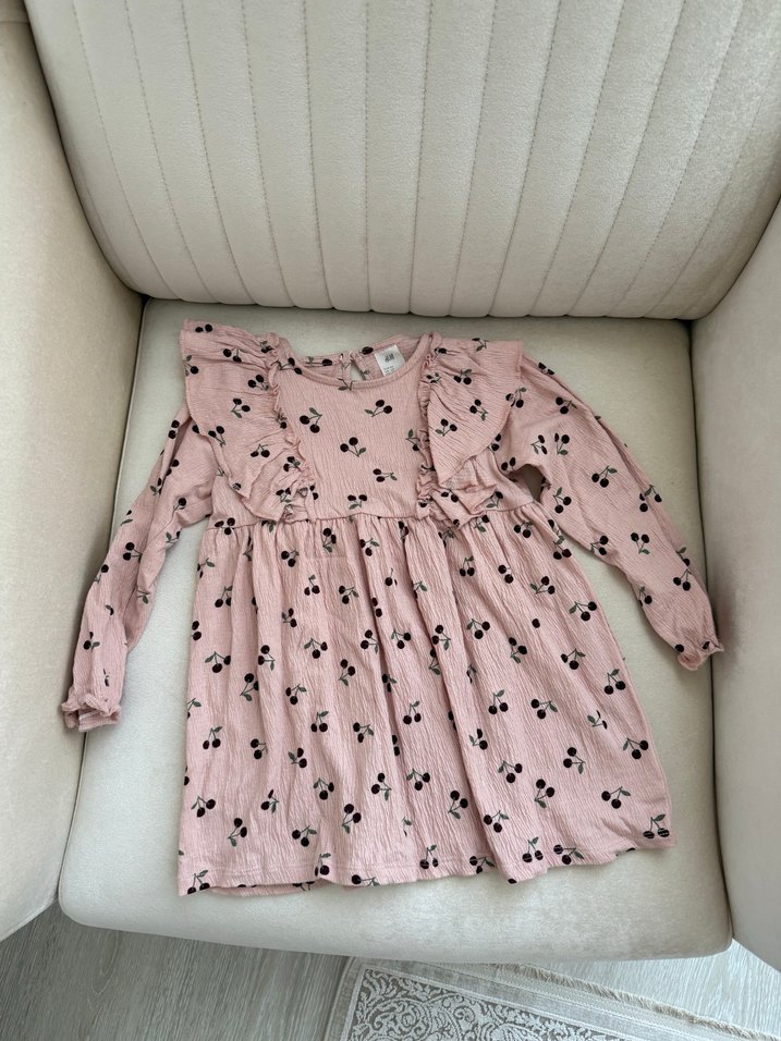 Uzun kollu, fırfırlı bol kesim kız çocuk elbisesi. Yumuşak sentetik kumaştan, pastel pembe ve kiraz desenli. BEDEN OLARAK 92 1.5-2 YAŞ YAZIYOR AMA 2 YAŞ İÇİN KÜÇÜK. SADECE 1 KEZ GİYİLDİ.