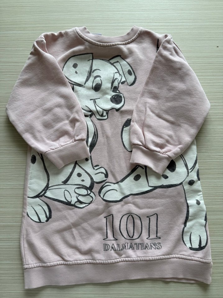 Pastel pembe renkte, uzun kollu ve yuvarlak yakalı, yumuşak kumaştan bol kesim kız sweatshirtü. Üzerinde 101 Dalmaçyalılar baskısı ve düğme detayları bulunur.