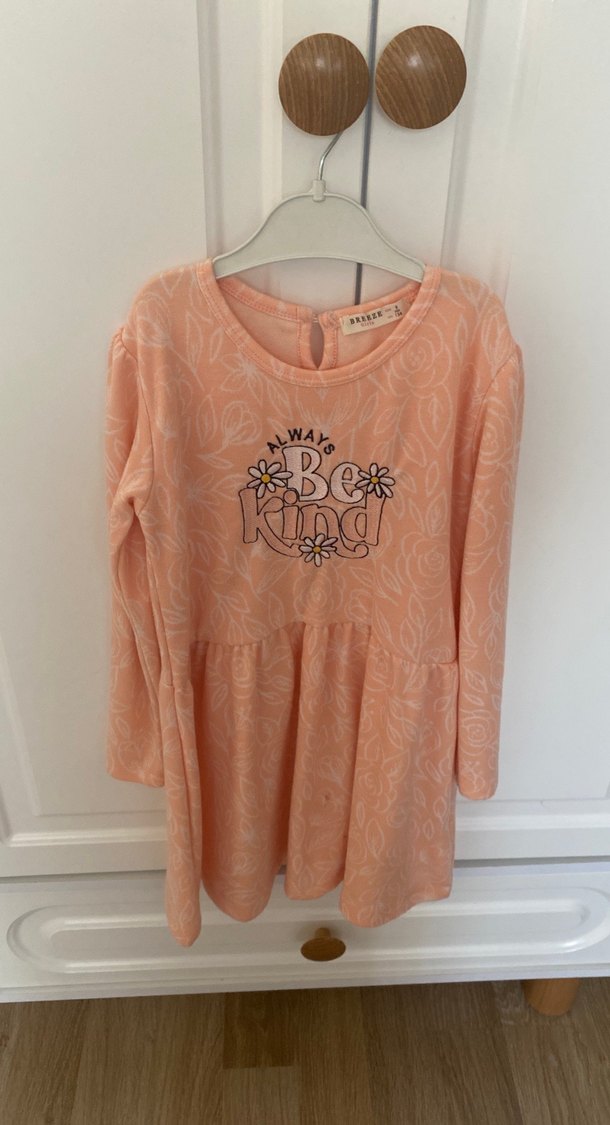 Uzun kollu, yuvarlak yaka, bol kesim pembe kız elbisesi. Örme dokusu ve çiçek desenli baskı, 'Always Be Kind' yazılı.