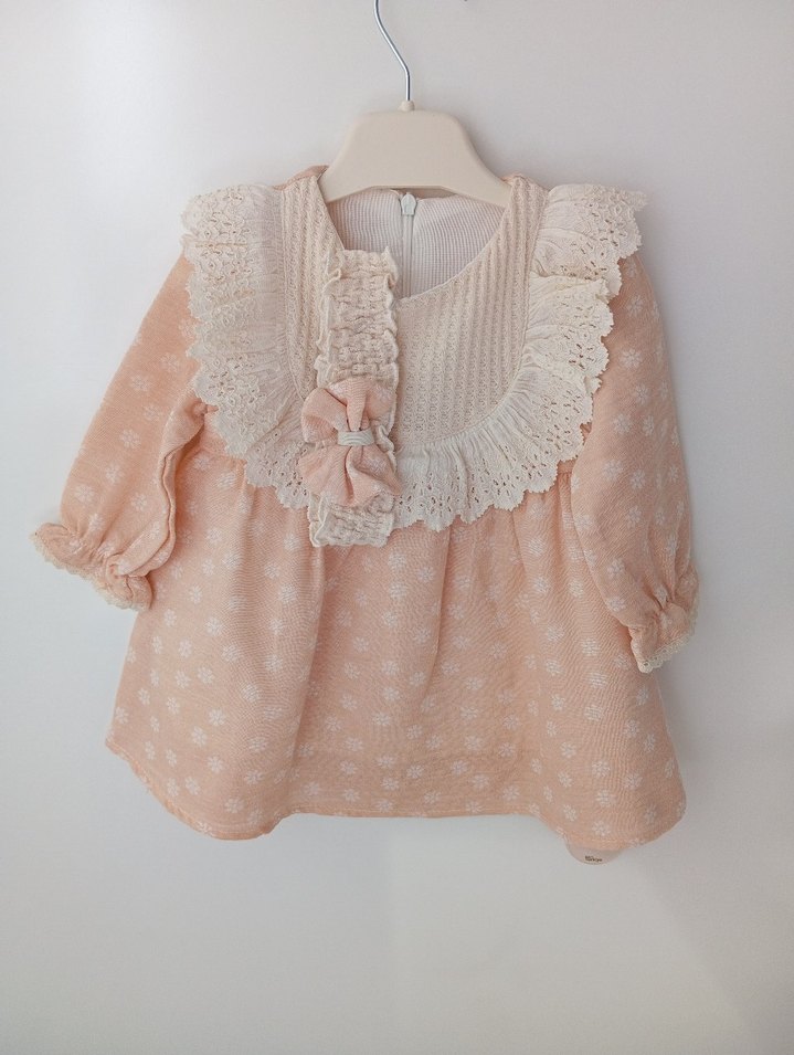 Nakışlı desenlere ve fırfır detaylara sahip, yuvarlak yaka pembe triko kız elbisesi. Vintage tarzda, uzun kollu ve dantel süslemelidir.