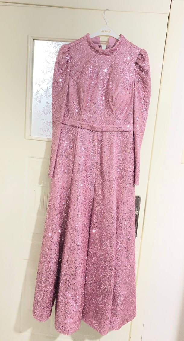 Uzun kollu, yüksek yakalı ve simli detaylara sahip pembe parlak abiye elbise, klasik zarif kesimle düğünler için uygundur.