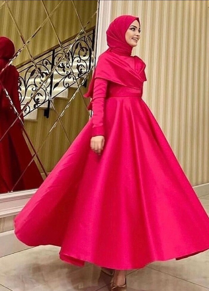 Uzun, bol kesim, yüksek yakalı ve uzun kollu dökümlü tasarıma sahip, parlak pembe kumaştan düğünlere uygun abiye. 38/36 uyumlu
