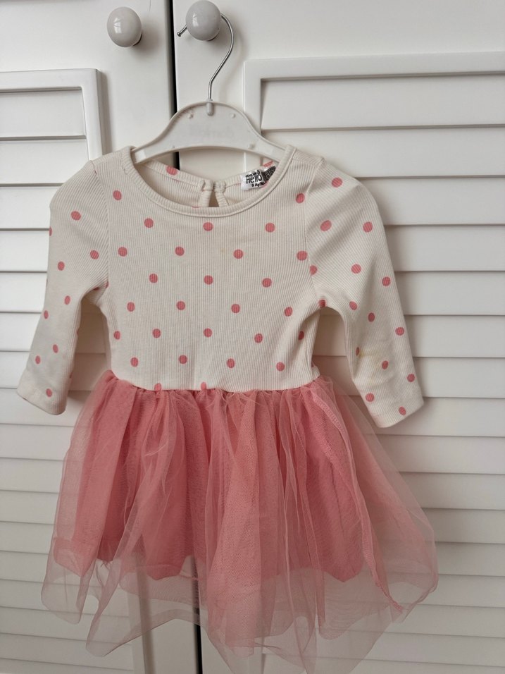 Uzun kollu, bisiklet yaka ve pamuklu kumaştan yapılmış, pembe puantiyeli üst kısmı bulunan, pastel pembe kat kat fırfırlı etekli kız elbisesi.