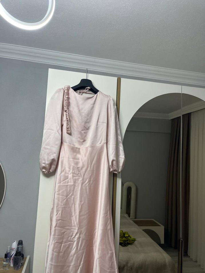 Uzun kollu, salaş kesim elbise, yüksek yakalı ve pastel pembe renkli ipeksi kumaştan. Minimalist ve sade tarzda drapeli detaylara sahiptir.