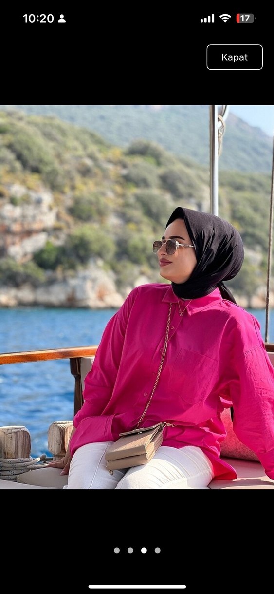 Uzun kollu, yüksek yakalı pembe tunik, salaş kesim ve drapeli ipeksi kumaş ile. Parlak görünüm ve etnik desenle modest sokak stili için uygun.