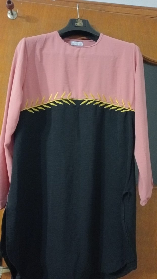 Uzun kollu, yuvarlak yakalı, sentetik kumaştan yapılmış bu uzun tunik, düzenli kesim ve drapeli tarzda, koyu pembe ve siyah renkte, nakış detaylıdır.