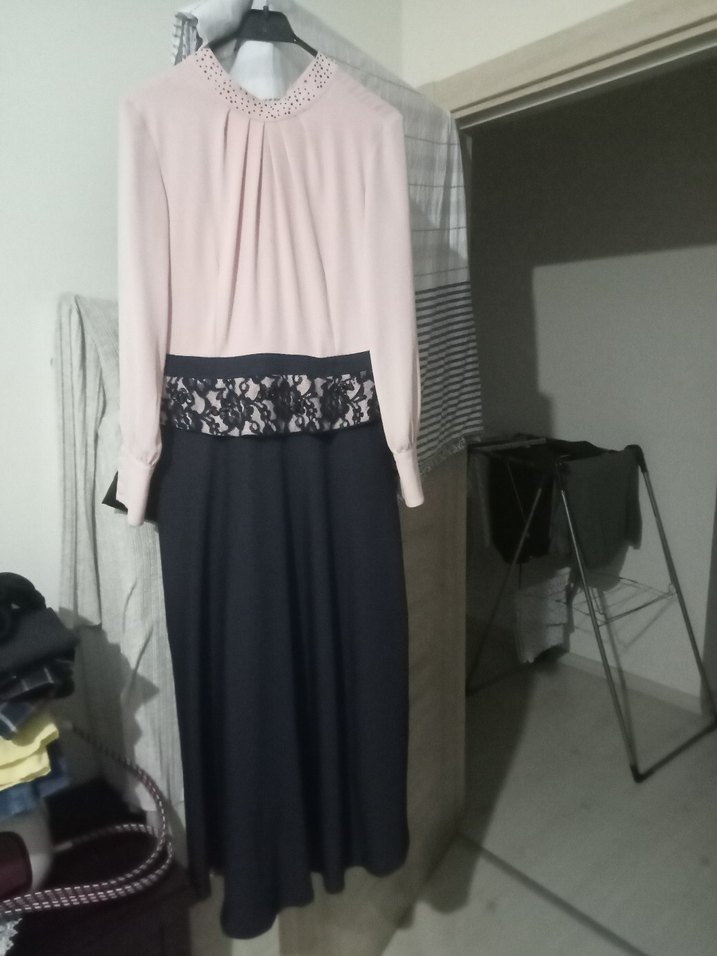 Yüksek yakalı, uzun kollu, pembe üst ve siyah etek kısmında dantel detaylı, dökümlü tasarımlı uzun kadın elbisesi. Sentetik kumaştan, hiç bir sorunu yoktur .Düğün için alınmıştır.