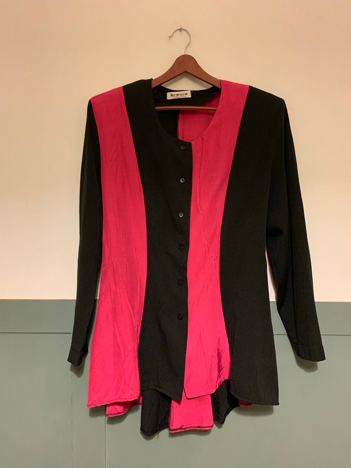 Uzun kollu, düğmeli ve notched lapel yakalı pembe-siyah ,vatkalı mini elbise,ofis için uygun, bol kesim ve ipeksi kumaş ile.