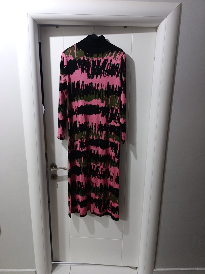 Uzun, dar kesim pembe triko elbise, Uzun kollu ve boğazlıdır, sentetik kumaştan yapılmıştır. Günlük kullanım için uygundur. boy 132 cm göğüs 42 cm kol altından öteki kol altına ölçü 46 cm