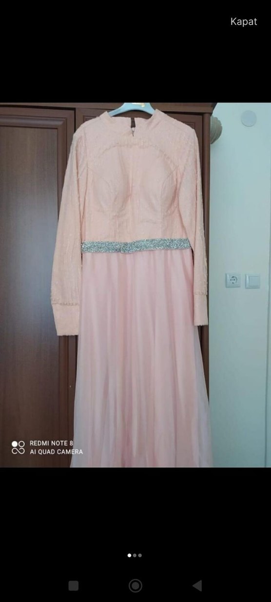 Uzun kollu, tek renk pastel pembe, kemerli vintage tarzda, dar kesim, tek parça abiye elbisedir. Düğünler için uygundur.