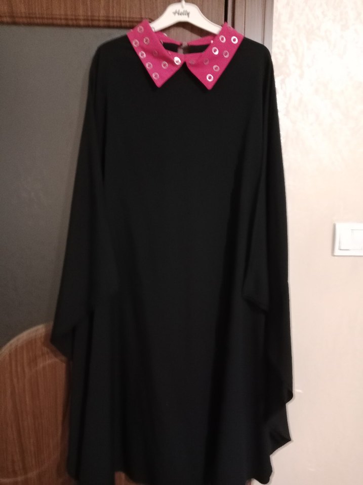 Siyah, uzun kollu, dökümlü kesime sahip tunik, koyu pembe yakası ile öne çıkar. Sentetik kumaştan, ofis kullanımı için uygundur.
