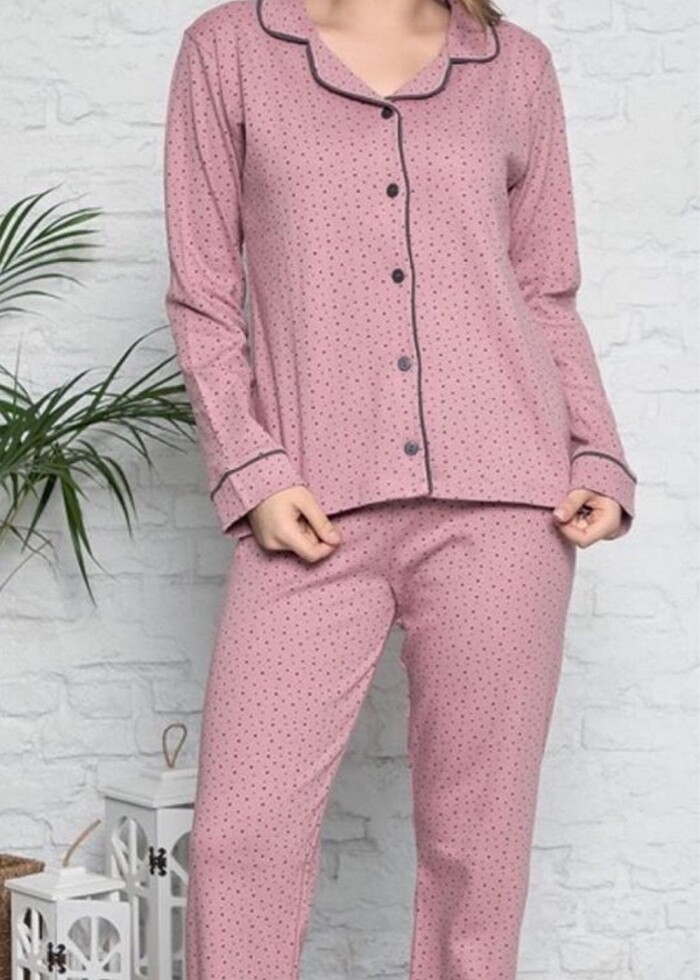Şık, kaliteli, kalın penye, kışlık pijama takımı Önden düğmelidir Puantiye desenli Tam kalıp