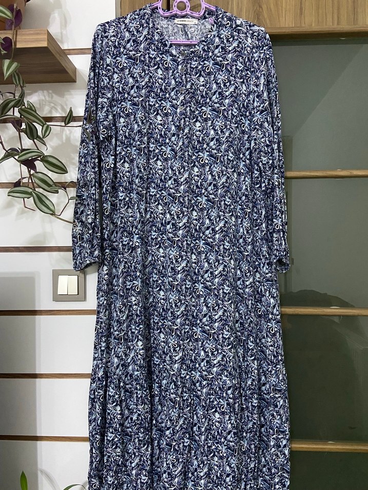 Pamuk kumaştan, uzun kollu ve yüksek yakalı pileli, mavi tonlarında batik desenli bol kesim uzun elbise. Bohem tarzda ✨