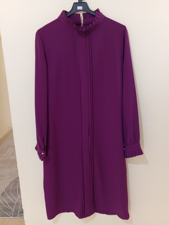 Uzun boy mor tunik, yüksek yakalı ve yakada ile manşette pileli detaylara sahiptir. Ürünün hiçbir sıkıntısı yoktur. Sadece birkaç kez giyildi.