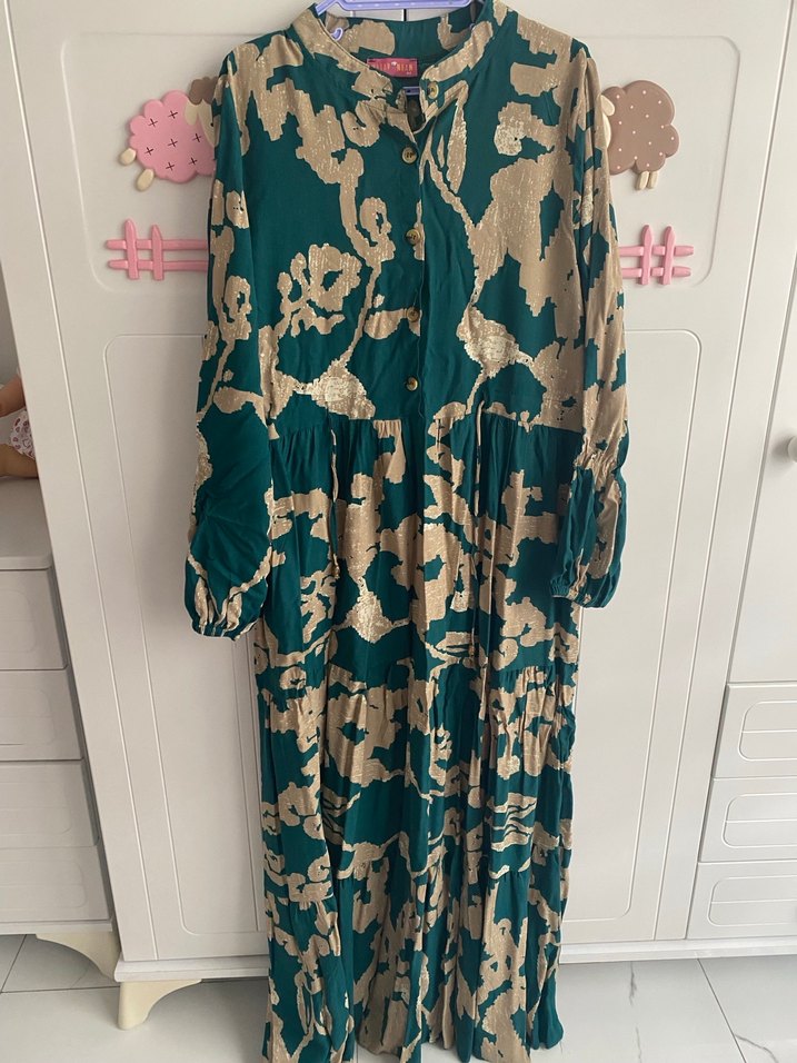Bu uzun yeşil elbise, bol kesim, pile detayları ve yüksek yakaya sahiptir. Uzun kollu, batik desenli ve yumuşak sentetik kumaştandır.