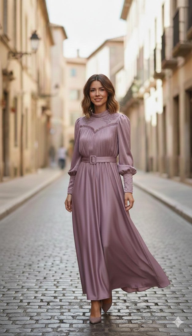 Yüksek yakalı, pilili detaylara sahip uzun bej abiye elbise. Uzun kollu ve kemerli, bol kesimdir. Düğünler için uygundur.