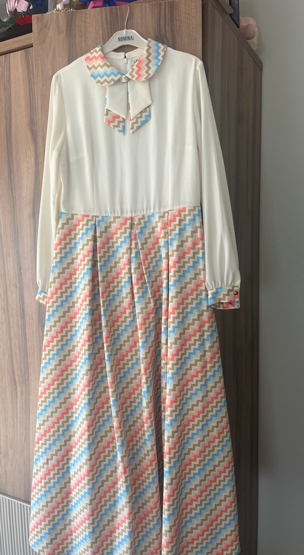 Uzun kollu, tekne yaka üst kısmı ve renkli zigzag desenli pilili etek kısmı olan uzun elbise. Rahat kesimli, vintage bohem tarzda, yumuşak sentetik kumaştan yapılmıştır.