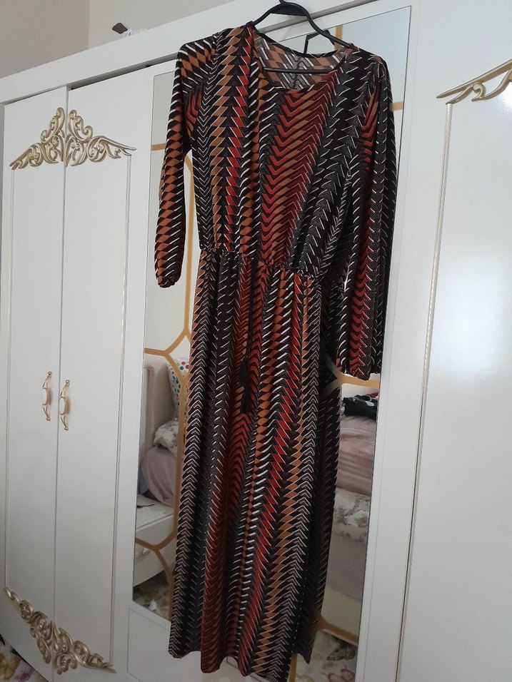 Kadınlar için uzun kollu, pilili, bol kesim elbise. V yakalı, koyu renkli çok renkli desene sahip bohem tarzda.