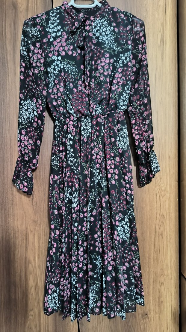 Pilili detaylara ve yüksek yakaya sahip uzun, bol kesim elbise. Sentetik kumaştan yapılmış, koyu çok renkli çiçek desenli bohem tarzda, romantik akşamlar için uygun.