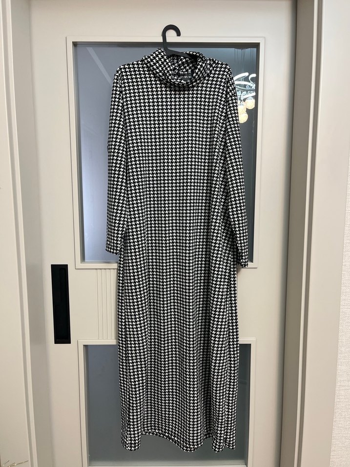 Uzun kollu, yüksek yakalı ve pilili detaylara sahip gri ekose elbise. Sentetik kumaştan, normal kesim ve Paris normcore stilinde, günlük kullanıma uygun şık bir parça.