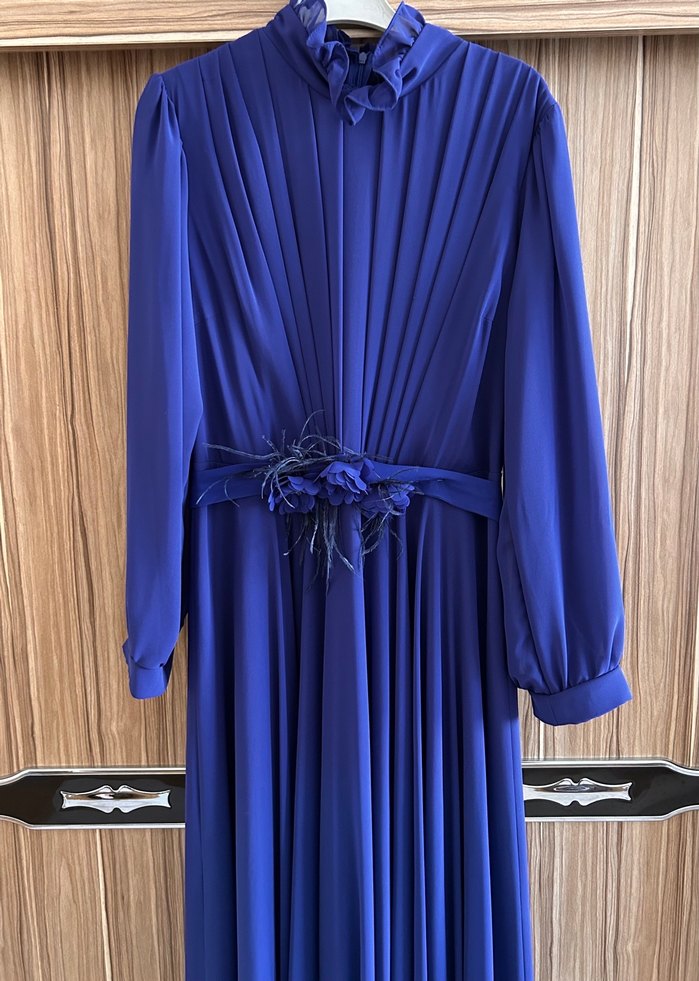 Uzun kollu, pilili ve yüksek yakalı lacivert abiye elbise. Düzenli kesim, bağlama kemeri ve düğünler için uygun çiçek detaylı kemerle tamamlanmıştır.