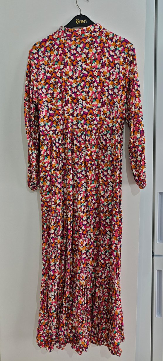Renkli, uzun kollu ve V yakalı bohem elbise, pilili detayları ve bol kesimi ile rahat bir kullanım sunar. Yumuşak sentetik kumaştan üretilmiştir.
