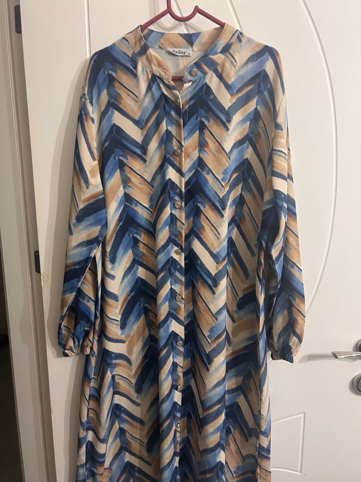 Çok renkli tie-dye desenli, uzun kollu ve piliseli, bol kesim bohem tarzda sentetik kumaştan yapılmış uzun elbise.
