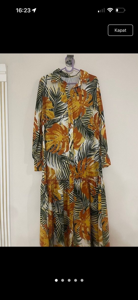 Uzun kollu, tekne yaka ve bol kesim piliseli elbise. Çok renkli, bohem tarzda, sentetik kumaştan yapılmıştır.