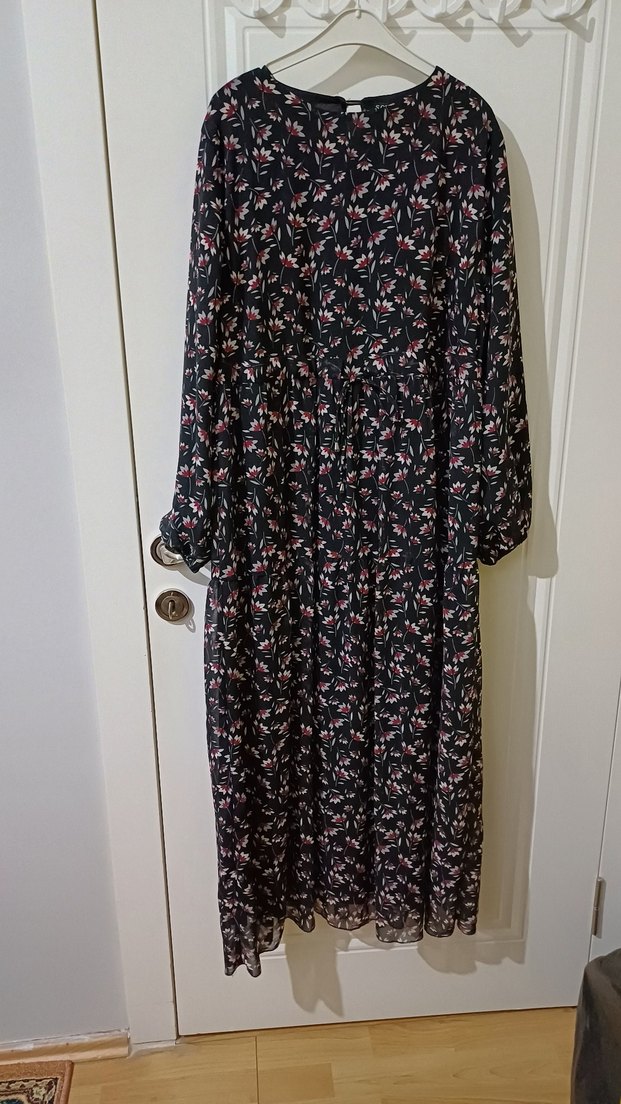 çiçek desenli elbise. elbisenin boyu 135 cm bel mesafesi 50 cm iki koltuk arası 50 cmdir.