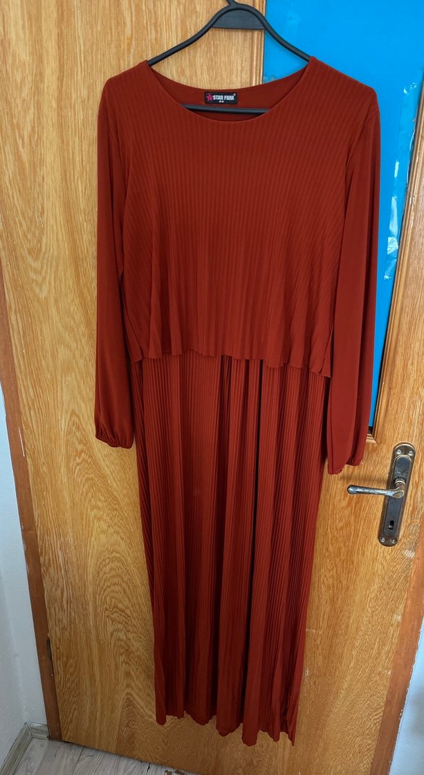 Uzun kollu, bol kesim kadın elbise, piliseli detaylara sahip. Yumuşak sentetik kumaştan, yuvarlak yakalı ve koyu kahverengi renkte, minimalist tarza uygun. Günlük kullanım için ideal.