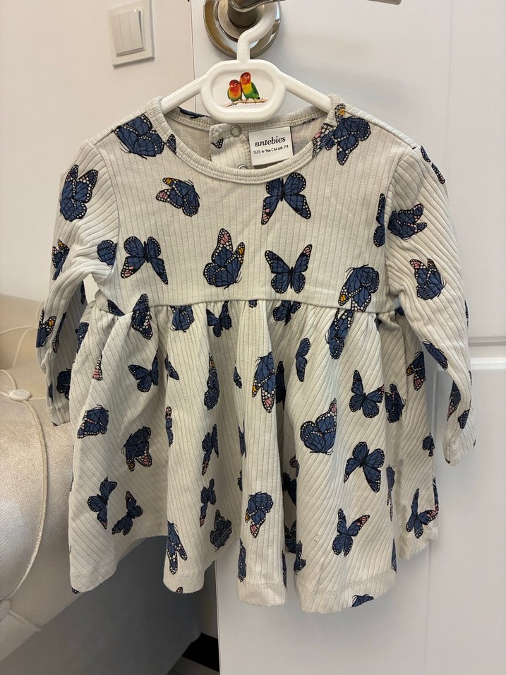 Antebisin ürünüdür. Uzun kollu, yuvarlak yaka ve piliseli detaylı bol kesim kız elbisesi. Yumuşak kumaştan, beyaz üzerine mavi kelebek desenlidir.