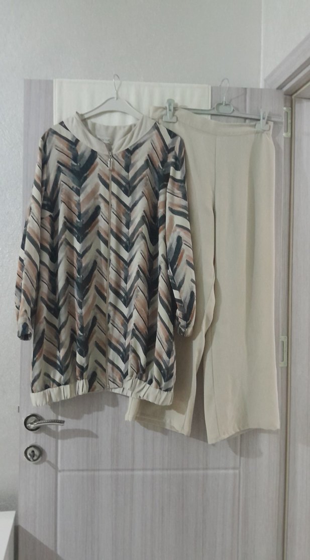 Bej ve gri tonlarında, salaş kesim ve piliseli detaylara sahip uzun kollu, bisiklet yaka mini takım. Günlük rahat kullanıma uygundur.